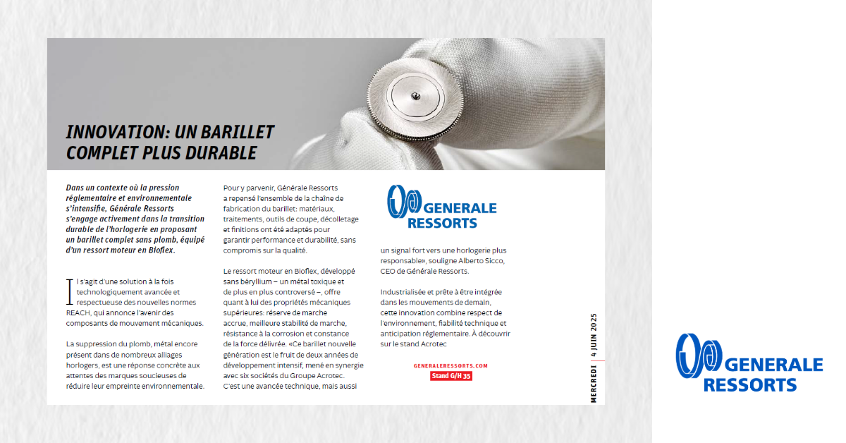 Générale Ressorts poursuit son engagement en faveur d’une horlogerie plus durable en lançant une innovation technique majeure : un barillet complet sans plomb, équipé d’un ressort moteur en Bioflex.